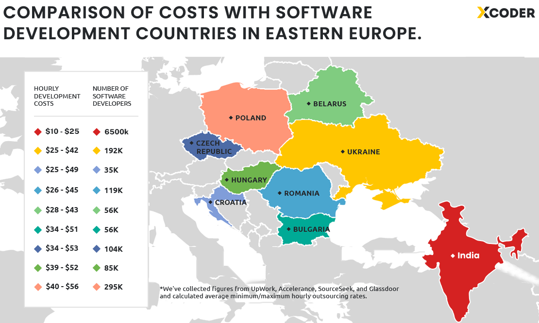 Compared to Ukraine, Poland, Belarus, and the Czech Republic, India offers more competitive rates for programming outsourcing and a much larger tech talent pool.